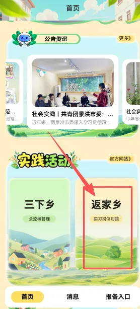 2、选择“社会实践”-“2026三下乡”栏目,进入“返家乡实习岗位对接”按照系统提示进行注册、登录。(首次登录用户需按提示注册账号并返回登录)